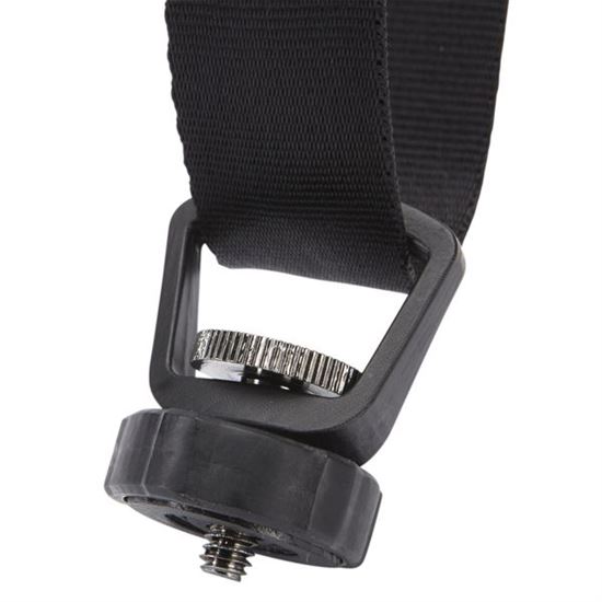 - Spona kĺzajúca po popruhu sa pripevňuje na fotoaparát prostredníctvom statívového závitu a dovoľuje tak nosiť fotoaparát bezpečne na boku objektívom smerom dolu