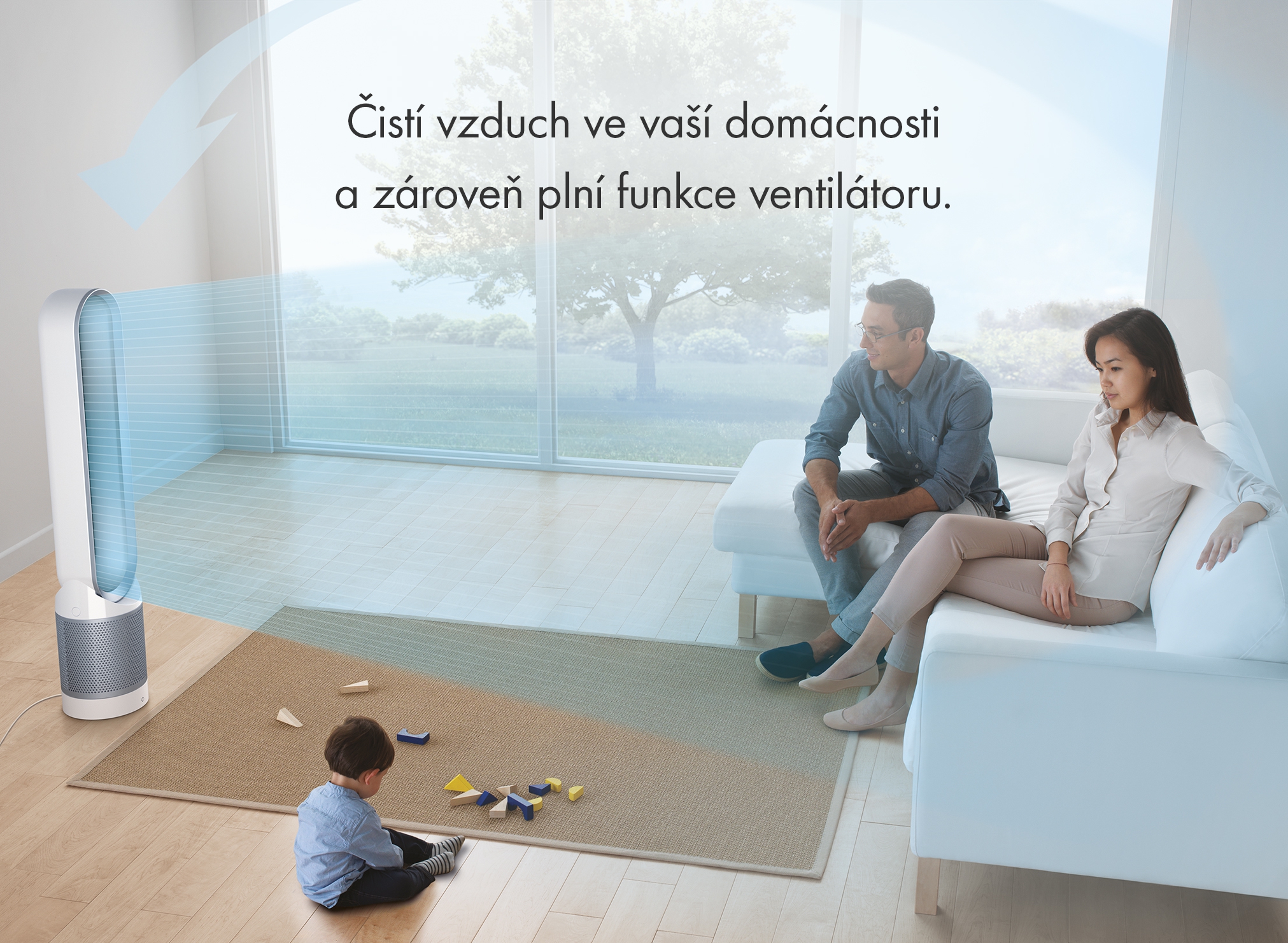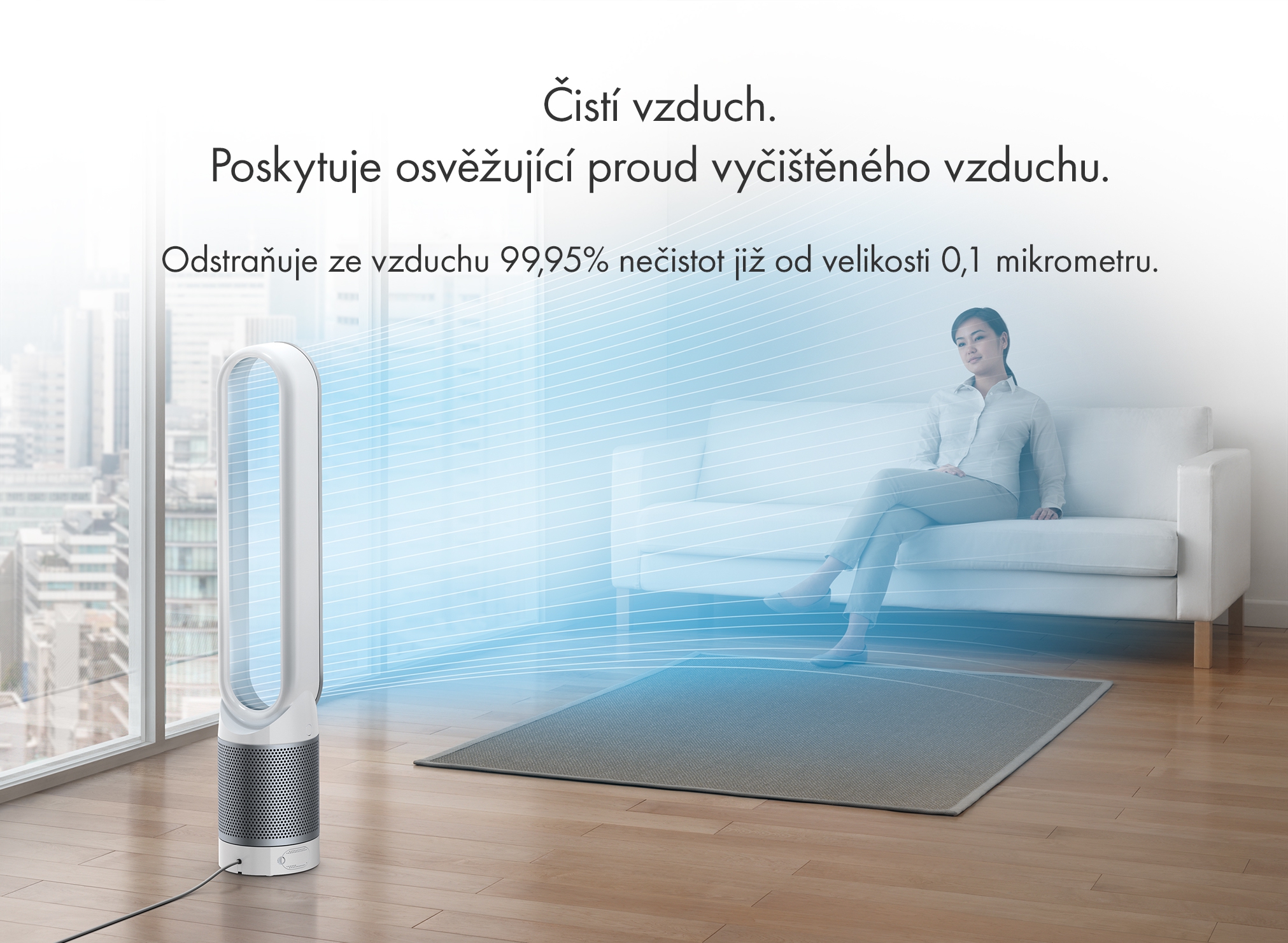 Čistí vzduch po celý rok. Poskytuje osvěžující proud vyčištěného vzduchu v létě.