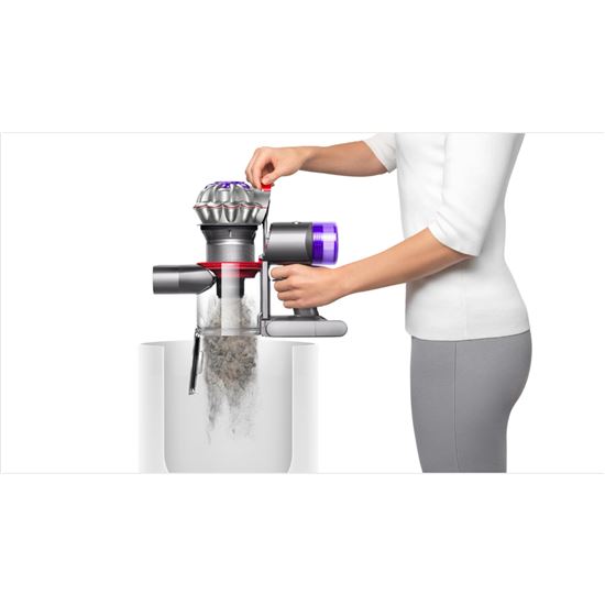 Bezdotykové vysypávanie zbernej nádoby. Hygienický mechanizmus uvoľní nečistoty a prach jedným pohybom – nemusíte sa ich teda dotýkať. Úhľadné uloženie a nabíjanie. Váš vysávač Dyson V8™ Advanced je vždy po ruke v nabíjacom držiaku a pripravený na použitie, keď ho potrebujete.