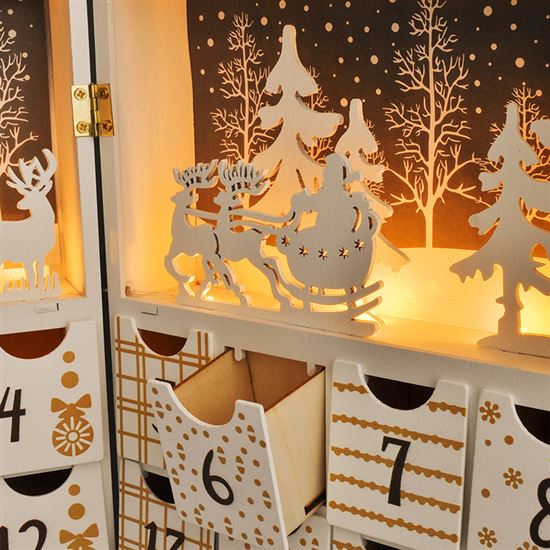 LED adventný kalendár so zimnými a vianočnými motívmi je originálnym doplnkom, ktorý vnesie do vášho domova tú pravú sviatočnú náladu. Vďaka ôsmim teplým bielym LED diódam jemne presvetľuje jednotlivé okienka a vytvára útulnú atmosféru počas celého adventu. Kalendár je vyrobený z kvalitného dreva v elegantnej bielej farbe, ktorá skvele ladí s tradičnými aj modernými vianočnými dekoráciami. Rozmery 40 x 30 x 4,5 cm umožňujú jednoduché umiestnenie na poličku, komodu alebo parapet, kde sa stane neprehliadnuteľnou súčasťou vášho interiéru.