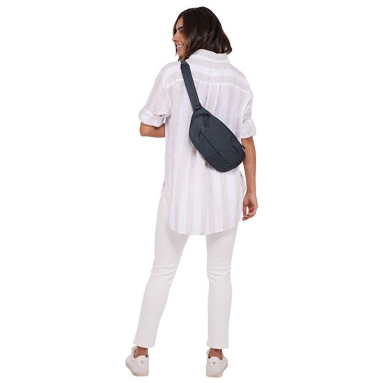 - Uchovávajte dôležité predmety v bezpečí: Bezpečnostné vrecko na zadnej strane chráni dôležité predmety, ako je pas alebo peňaženka, priamo u tela.