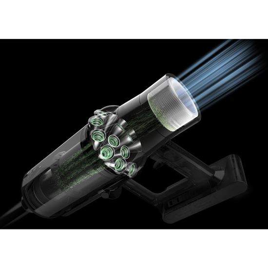 Inteligentné spúšťacie tlačidlo je navrhnuté tak, aby maximalizovalo efektivitu a predĺžilo výdrž batérie. Vysávač sa spína okamžite – stačí stlačiť a okamžite máte k dispozícii plný sací výkon. Keď tlačidlo pustíte, prístroj sa ihneď zastaví, takže počas prenášania medzi miestnosťami alebo pri krátkych prestávkach nespotrebúva žiadnu energiu. Tento intuitívny systém zaisťuje, že vysávač pracuje len vtedy, keď ho naozaj potrebujete. Žiadne zbytočné vybíjanie batérie, žiadne kompromisy vo výkone. Jednoduché, prirodzené a mimoriadne úsporné riešenie, ktoré oceníte pri každodennom používaní.