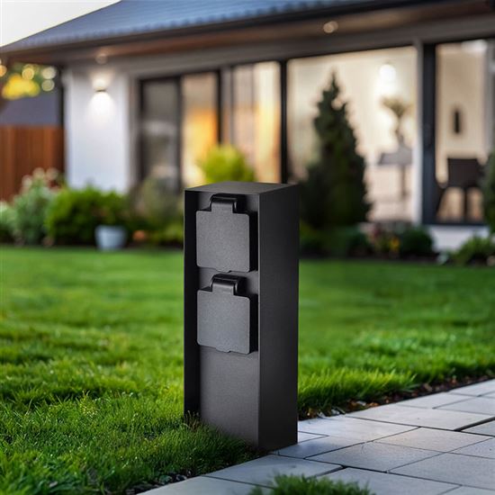 Dve zásuvky s detskými poistkami sú chránené samouzatvárateľnými krytkami, ktoré bránia vniknutiu vlhkosti a nečistôt. Vďaka krytiu IP44 je stĺpik vhodný aj na použitie za dažďa alebo vo vlhšom prostredí. Zásuvky zvládnu záťaž až 3680 W (16 A pri 230V~), čo je ideálne pre vonkajšie osvetlenie, záhradnú techniku aj bežné spotrebiče. Vhodný pre domy, pergoly aj firemné areály.